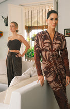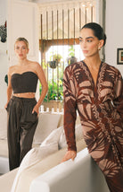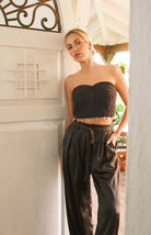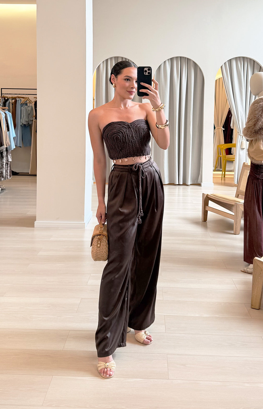 Conjunto de pantalón satinado con cintura elástica y cinturón trenzado, con un top tejido al frente y drapeado en la parte trasera, adornado con detalles colgantes. Diseño sofisticado con bolsillos funcionales y cierre elástico trasero para un ajuste cómodo y versátil.