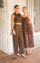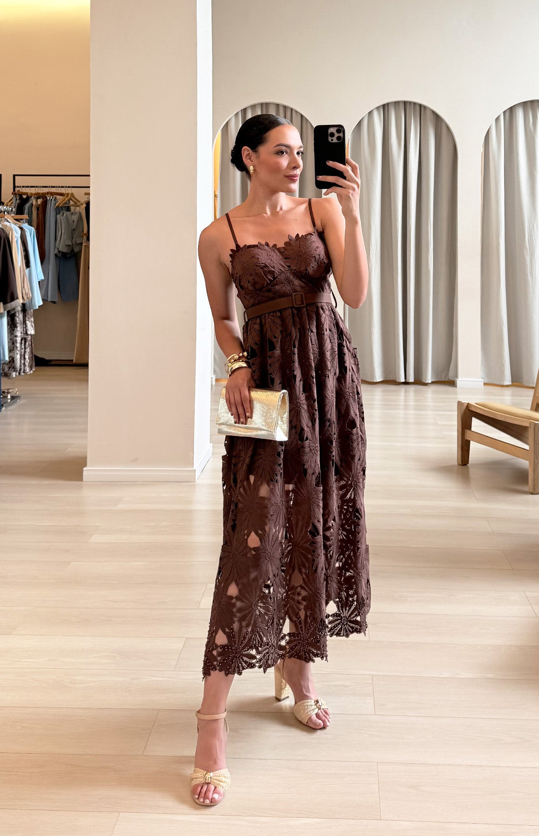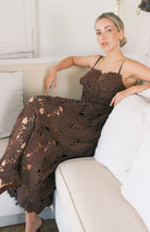Vestido en delicada tela guipur con tiras estructuradas y copas definidas. Adornado con perlas en el borde inferior que añaden un toque de refinamiento, cuenta con cierre trasero discreto para un ajuste impecable y elegante.