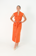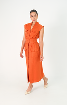 Este vestido camisero naranja sin mangas destaca por su diseño sofisticado y práctico, con cuatro bolsillos frontales con tapa que añaden funcionalidad y estilo. El cinturón a la cintura define la silueta, ofreciendo un look equilibrado y elegante, ideal para ocasiones que requieren un toque de distinción y modernidad.