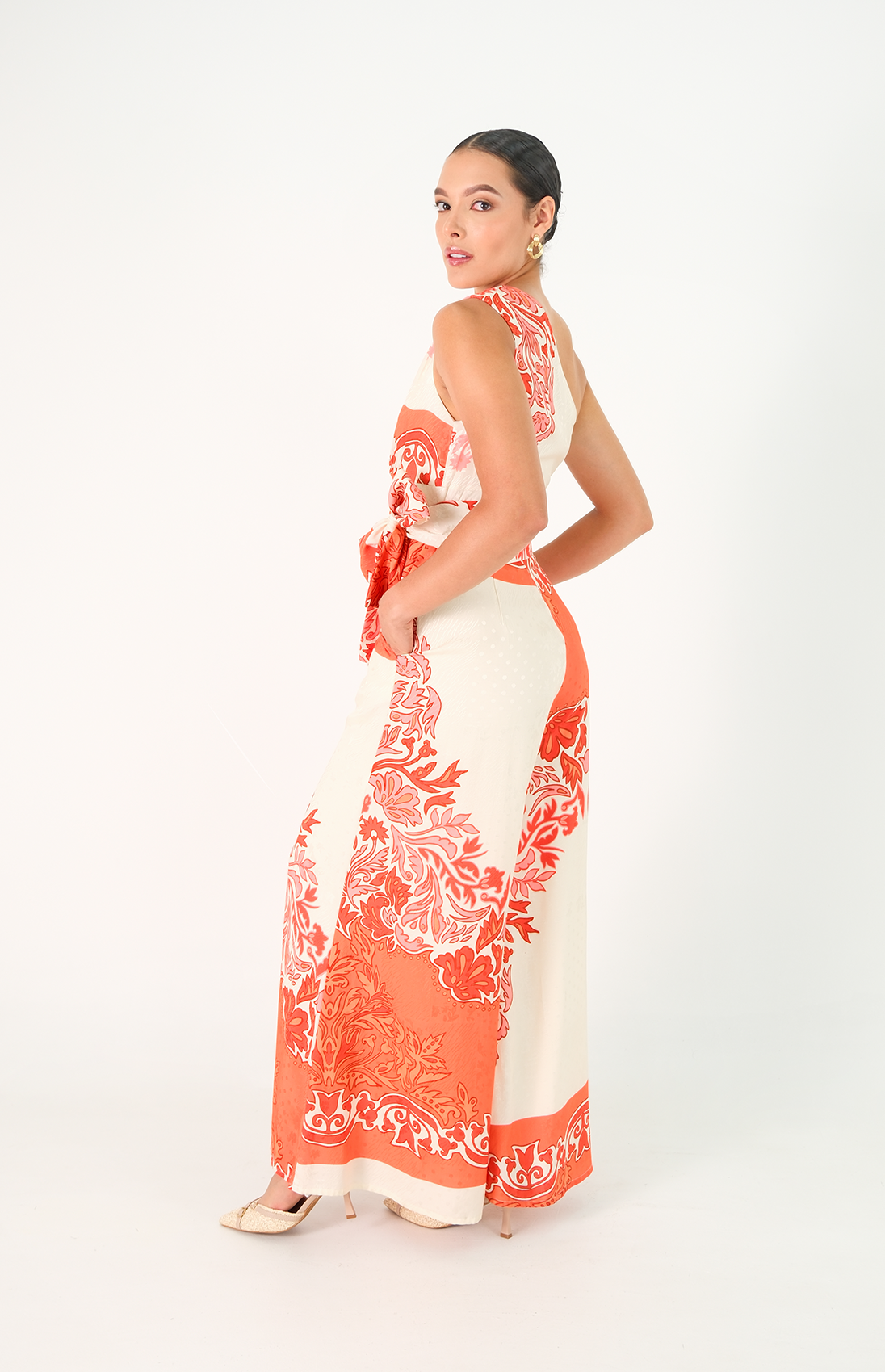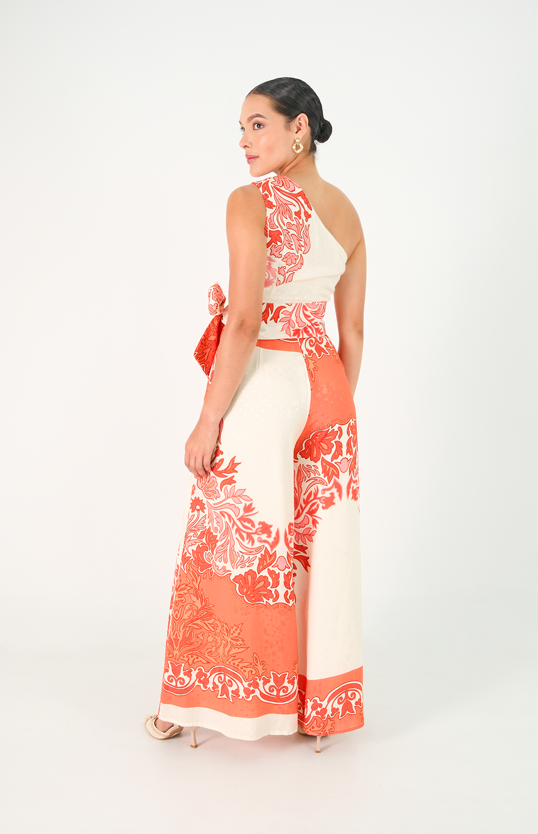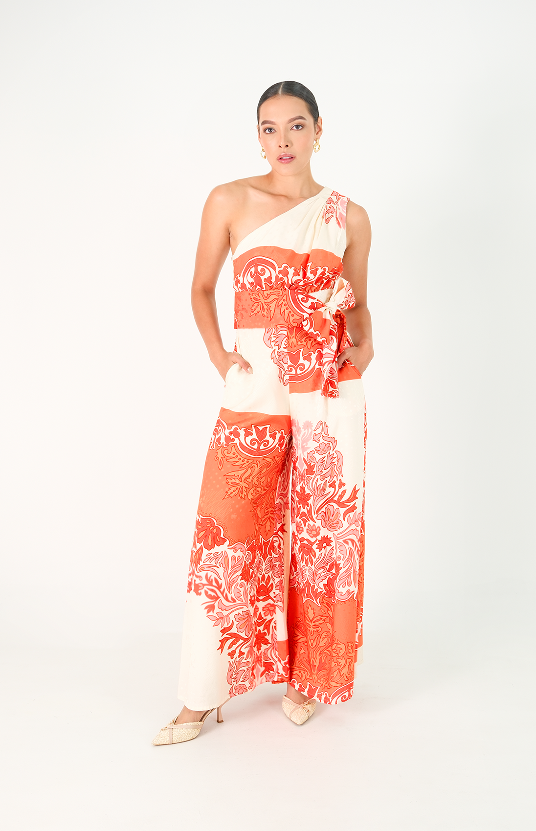 Este enterizo estampado en naranja y beige presenta un diseño sofisticado con un solo hombro que realza la elegancia femenina. Equipado con bolsillos funcionales y un cinturón que define la cintura, combina estilo y comodidad para un look distinguido y contemporáneo.