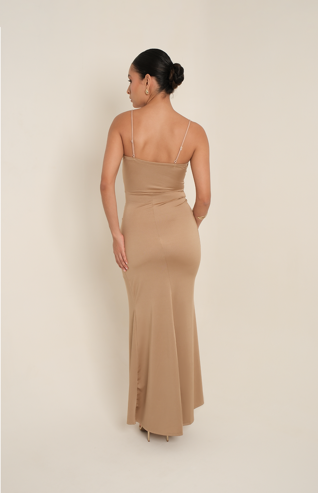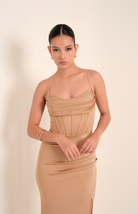 Este sensual vestido tipo corset en tono beige combina elegancia y un diseño tipo estructurado. Sus tiras y pinzas a un lado esculpen una silueta estilizada, mientras el escote drapeado en el busto y la abertura frontal añaden un toque de sofisticación y delicada sensualidad, ideal para ocasiones especiales.