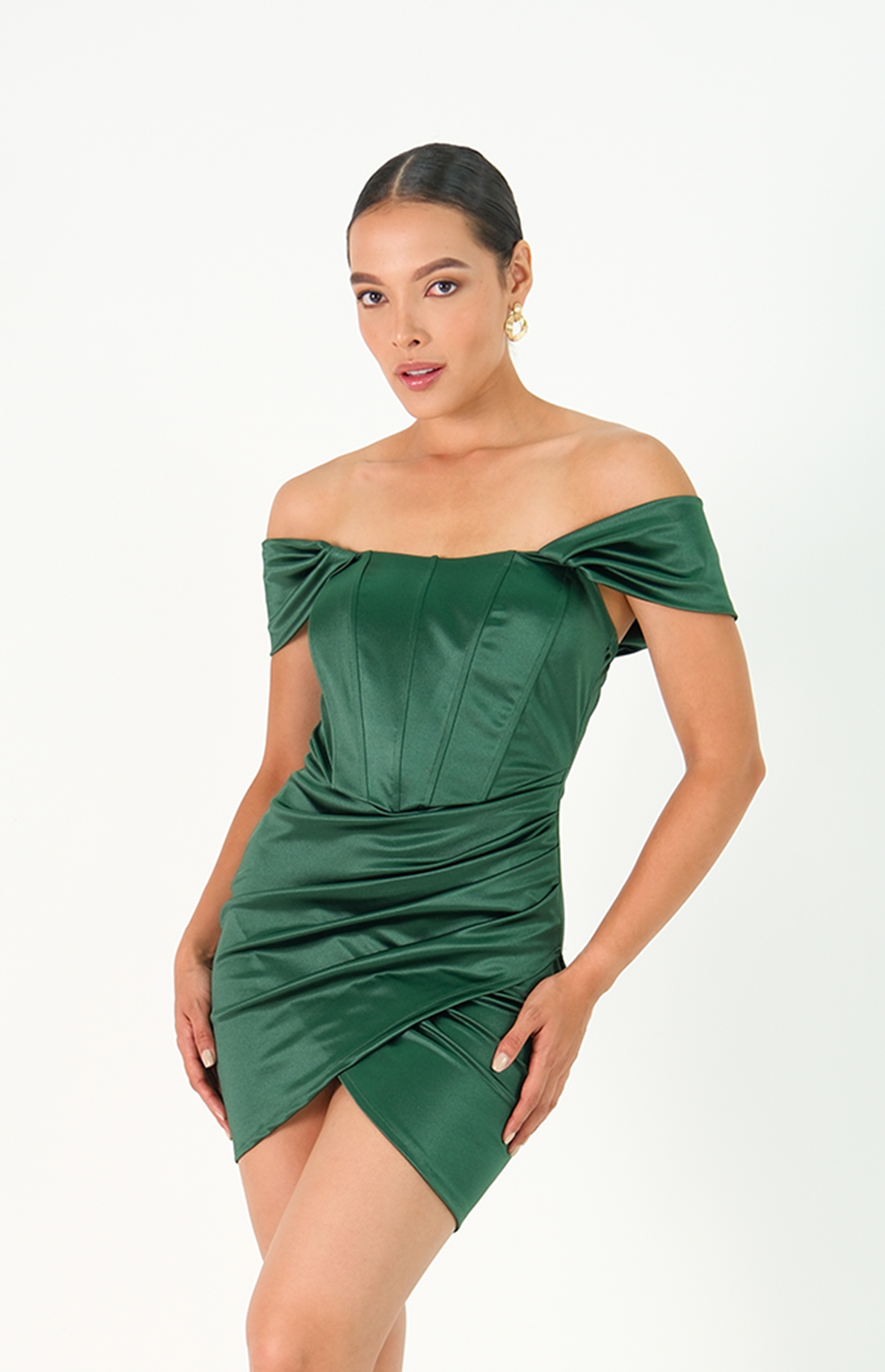 Este vestido corto satinado en un elegante tono verde botella presenta un diseño tipo corset que realza la figura con delicadeza. Su falda cruzada al frente aporta un toque contemporáneo y sofisticado, ideal para eventos especiales que requieren un estilo refinado y elegante.