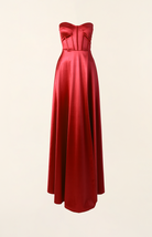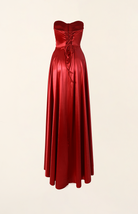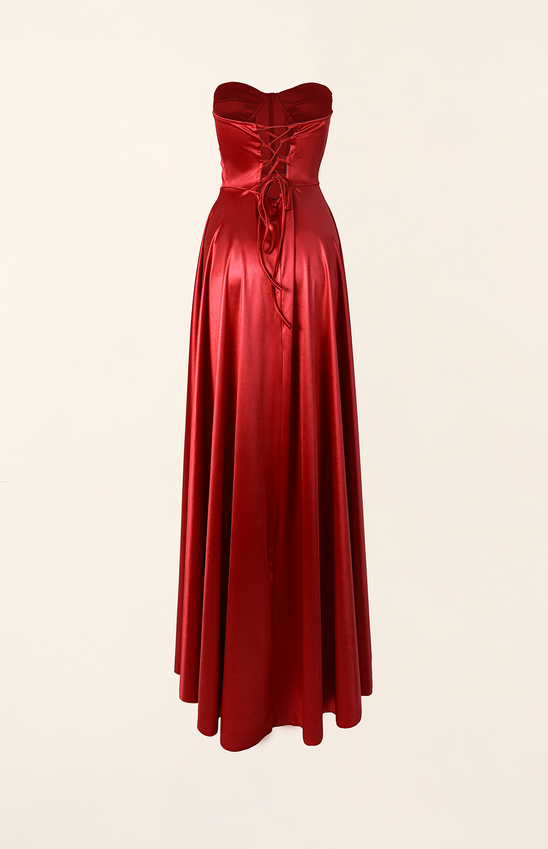 Este vestido rojo largo strapless tipo corset destaca por su diseño sofisticado y elegante. Su silueta ajustada realza la figura, complementada con una abertura en el lado derecho que brinda un toque de sensualidad y libertad de movimiento. Las tiras en la espalda permiten un ajuste personalizado para un calce perfecto. Ideal para ocasiones especiales donde la distinción y el estilo son esenciales.