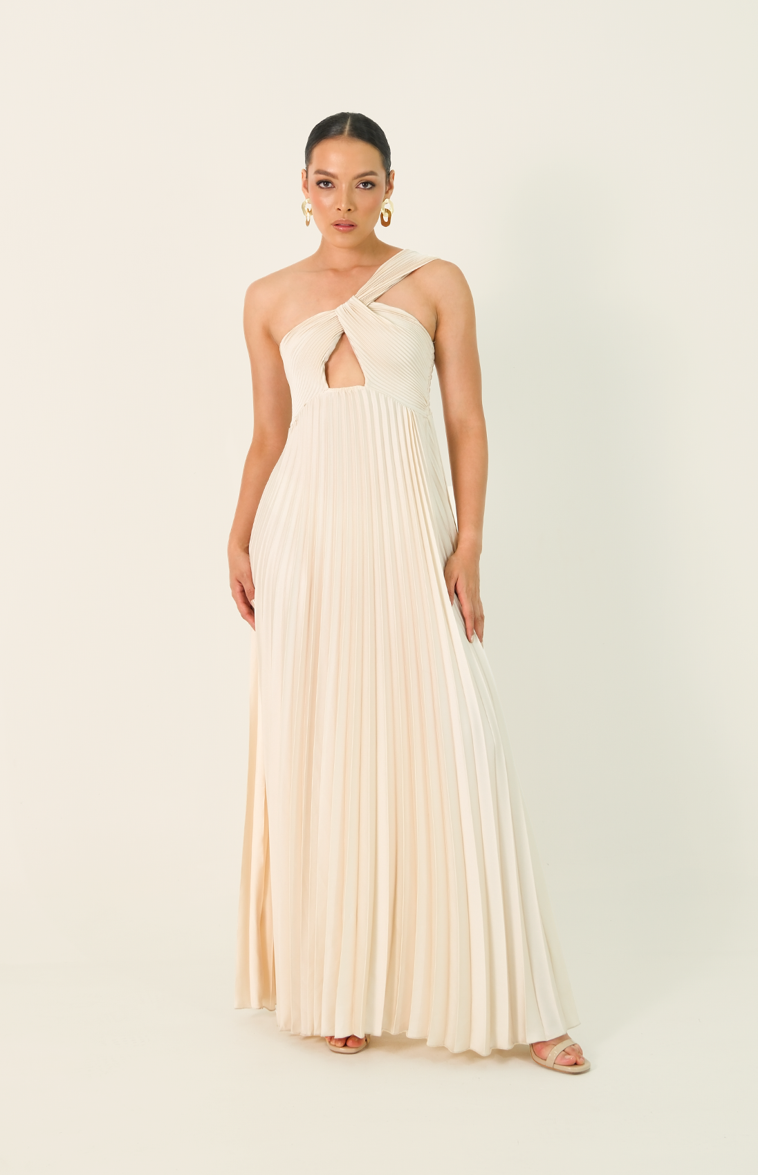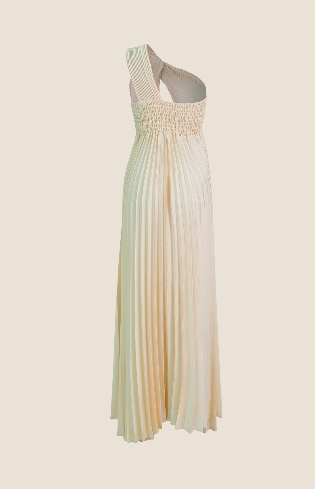 Este vestido plisado largo en color beige destaca por su diseño de un solo hombro que irradia elegancia y sofisticación. La textura plisada aporta un movimiento fluido y un detalle delicado, mientras que el corte asimétrico define la silueta de forma sutil y contemporánea. Ideal para eventos especiales, este vestido ofrece un estilo pulido y refinado que se distingue por su simplicidad y elegancia.