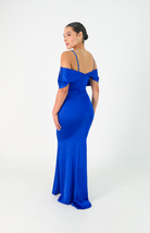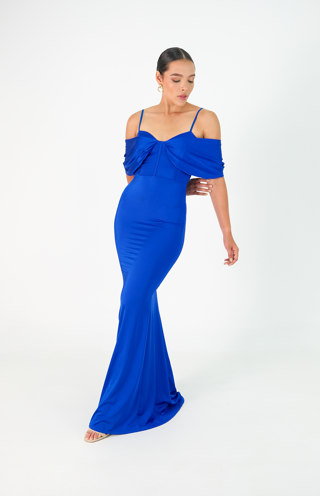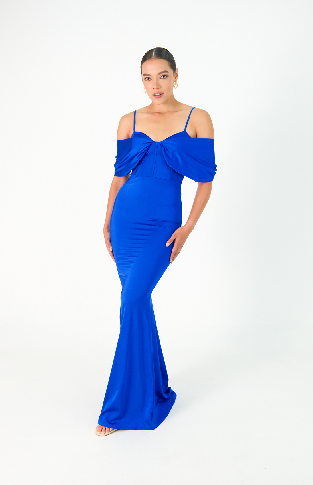 Este vestido largo azul rey de manga corta destaca por su escote tipo corcel, que aporta estructura y elegancia al diseño. Perfecto para eventos formales, combina sofisticación y estilo en una prenda que realza la figura con un toque refinado.