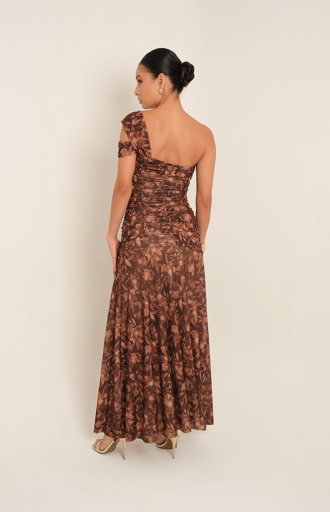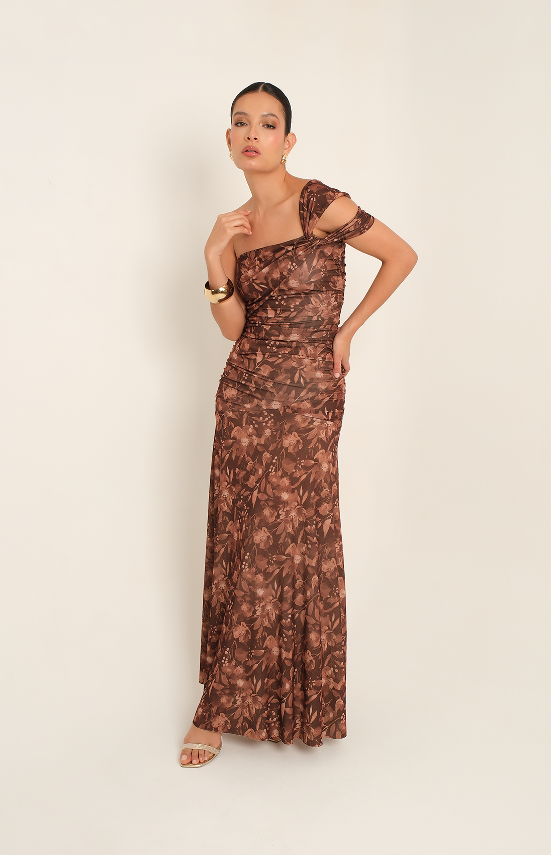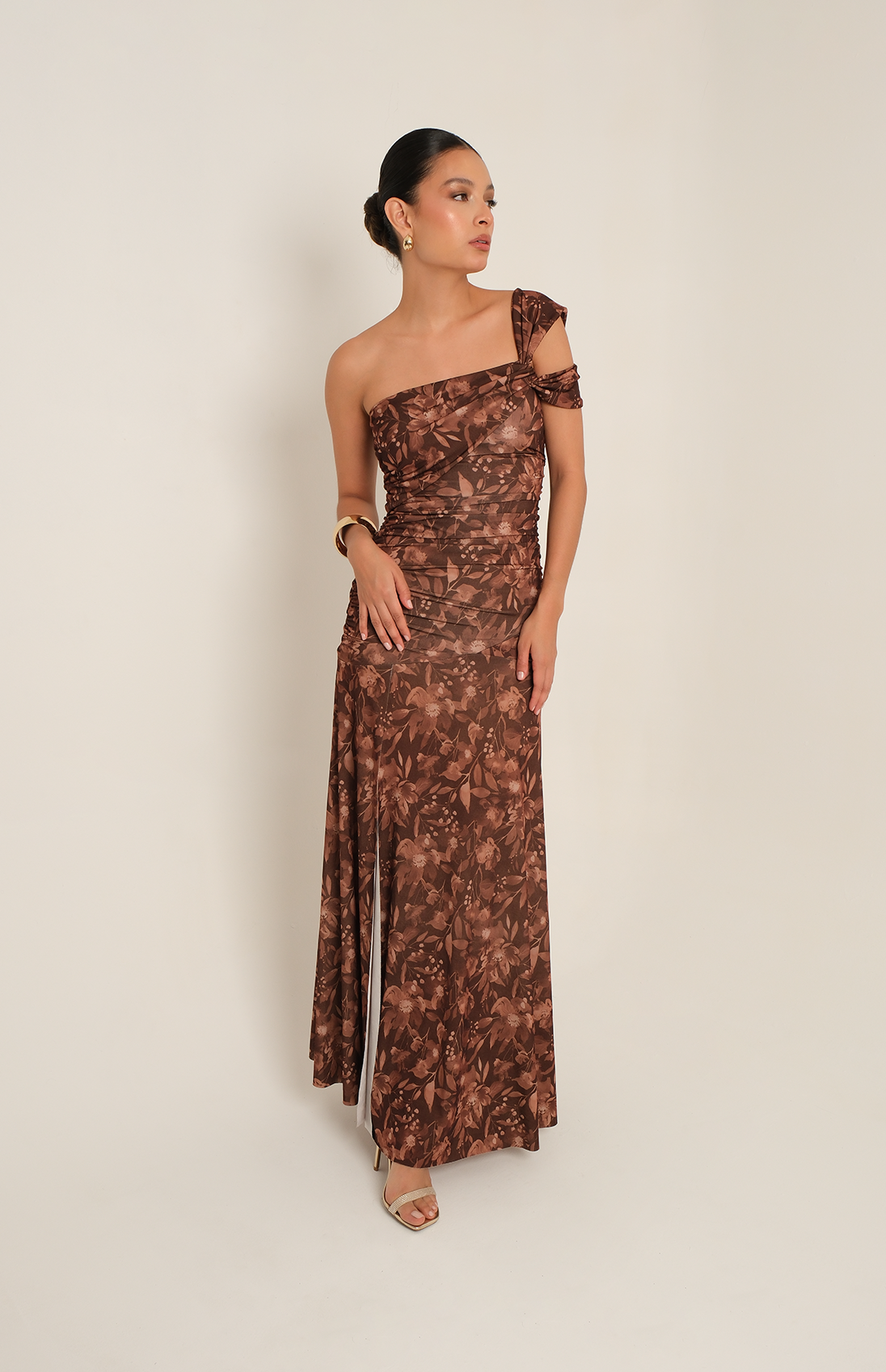 Este vestido largo café con estampado floral presenta un diseño asimétrico de un solo hombro, realzado por un detalle de doble tira que aporta un toque de distinción. La abertura en la pierna añade elegancia y un sutil aire de sensualidad, perfecto para ocasiones especiales y eventos formales.