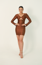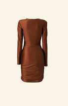 Este vestido corto en tono bronce destaca por su diseño de manga larga y cuello en V, que aportan elegancia y estilo. El escote en el abdomen añade un toque distintivo, mientras que el broche dorado en el busto y los detalles surcidos a los lados realzan la figura, creando un look sofisticado y moderno para cualquier ocasión especial.