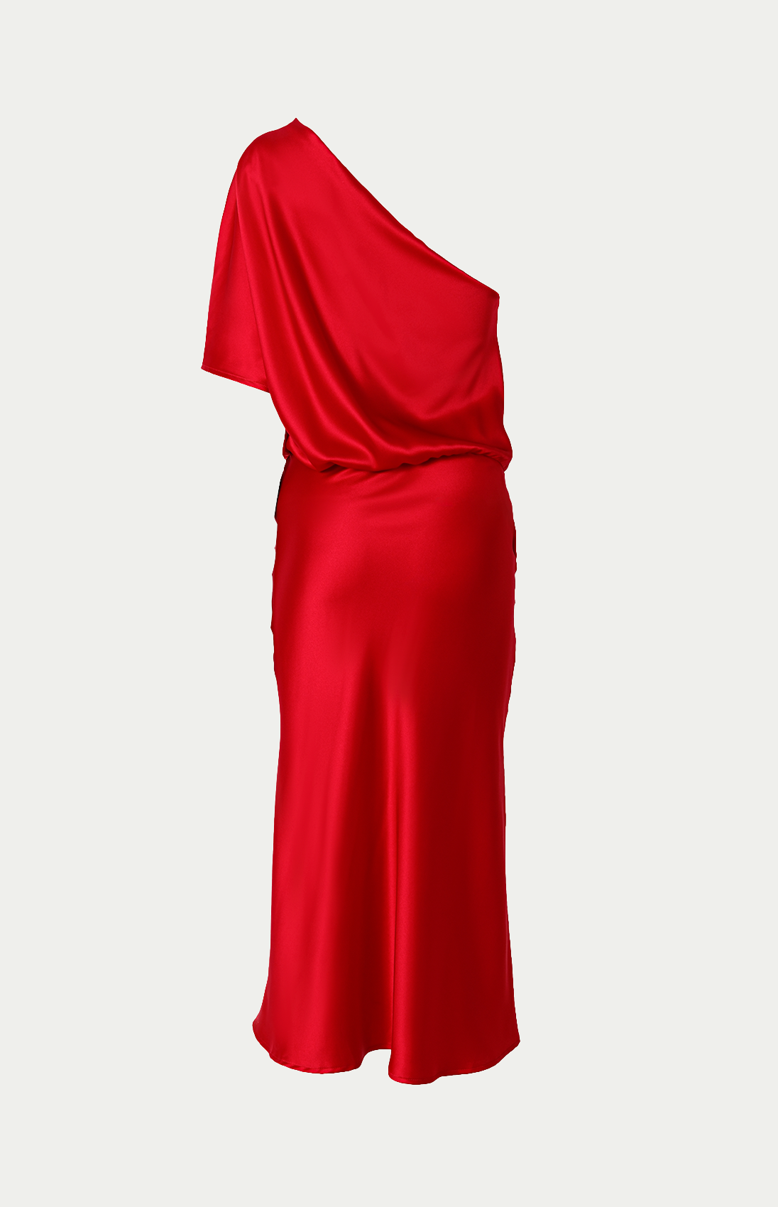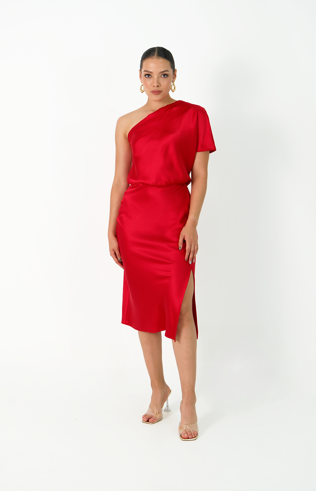 Este vestido satinado rojo destaca por su diseño asimétrico de un solo hombro, que aporta un aire moderno y elegante. El resorte en la cintura asegura un ajuste cómodo y favorecedor, mientras que la abertura lateral añade un detalle sutilmente sensual, perfecto para eventos sofisticados donde deseas brillar con distinción.