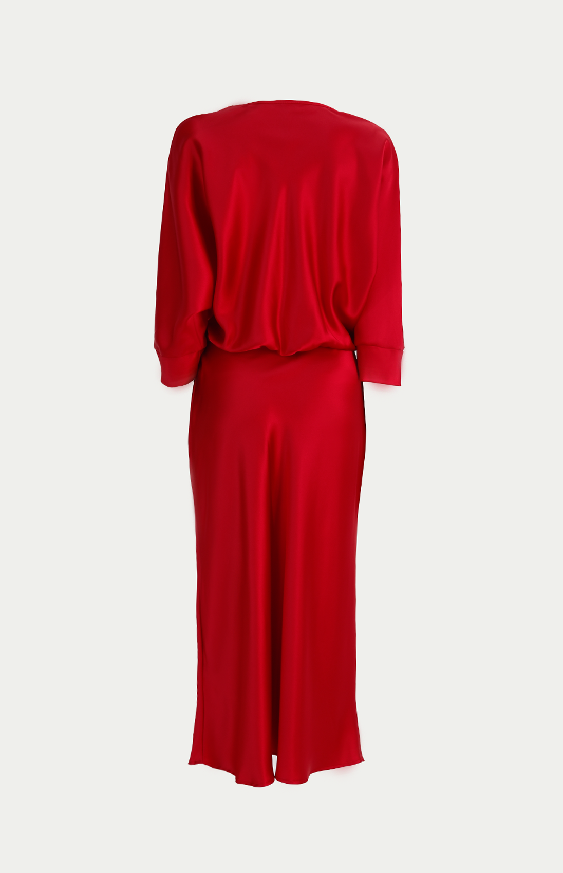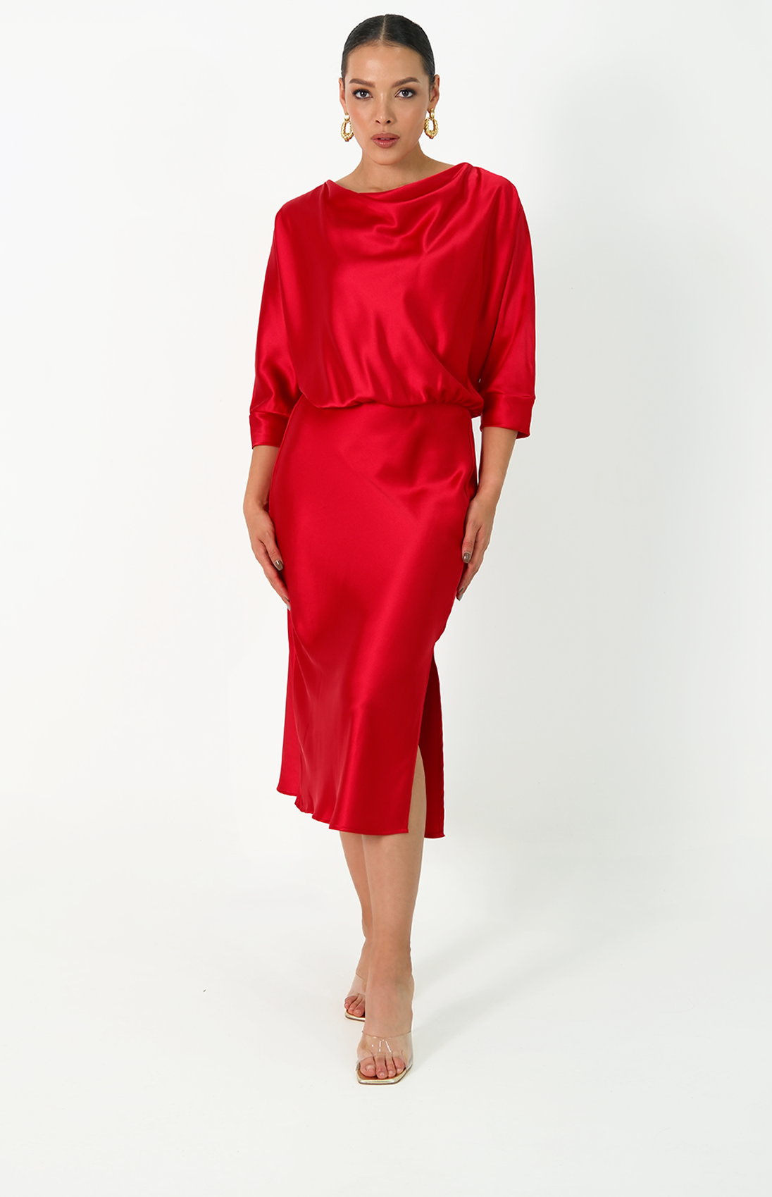 Este vestido satinado rojo destaca por su caída elegante en el busto y mangas tres cuartos con dobladillo, aportando un toque delicado y sofisticado. Su cintura con resorte garantiza comodidad y ajuste perfecto, mientras que la abertura lateral añade un detalle sutil y femenino, ideal para una ocasión especial o evento elegante.