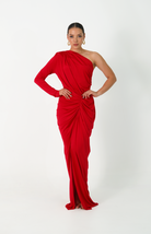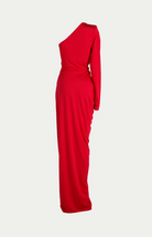 Este vestido largo rojo de un solo hombro combina sofisticación y estilo con una manga larga que aporta equilibrio y elegancia. El detalle recogido a un lado realza la silueta con un toque moderno y delicado, ideal para ocasiones formales donde destacar con distinción.