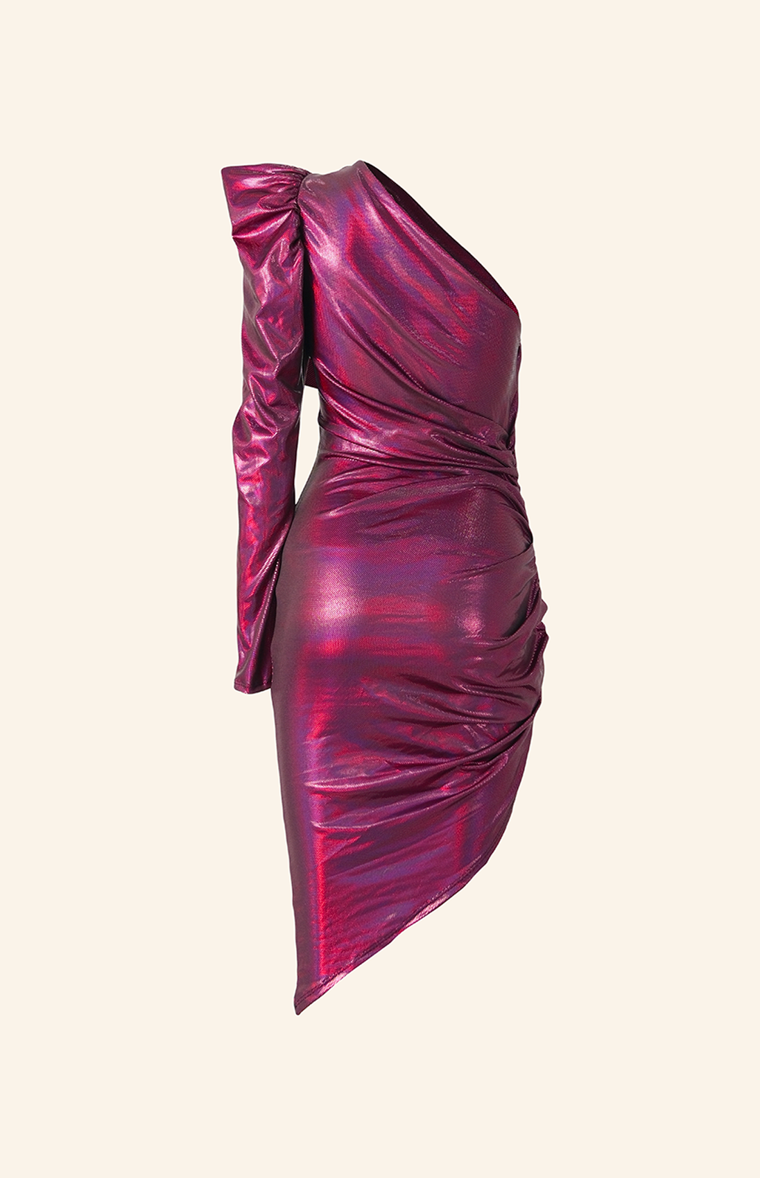 Este vestido corto metalizado en magenta realza tu estilo con un diseño de un solo hombro y un detalle corrugado en un lado, aportando un toque moderno y elegante. Su corte favorecedor resalta tu figura, ideal para brillar en eventos especiales con un look audaz y sofisticado. Perfecto para quienes desean destacar con una prenda única y vibrante.
