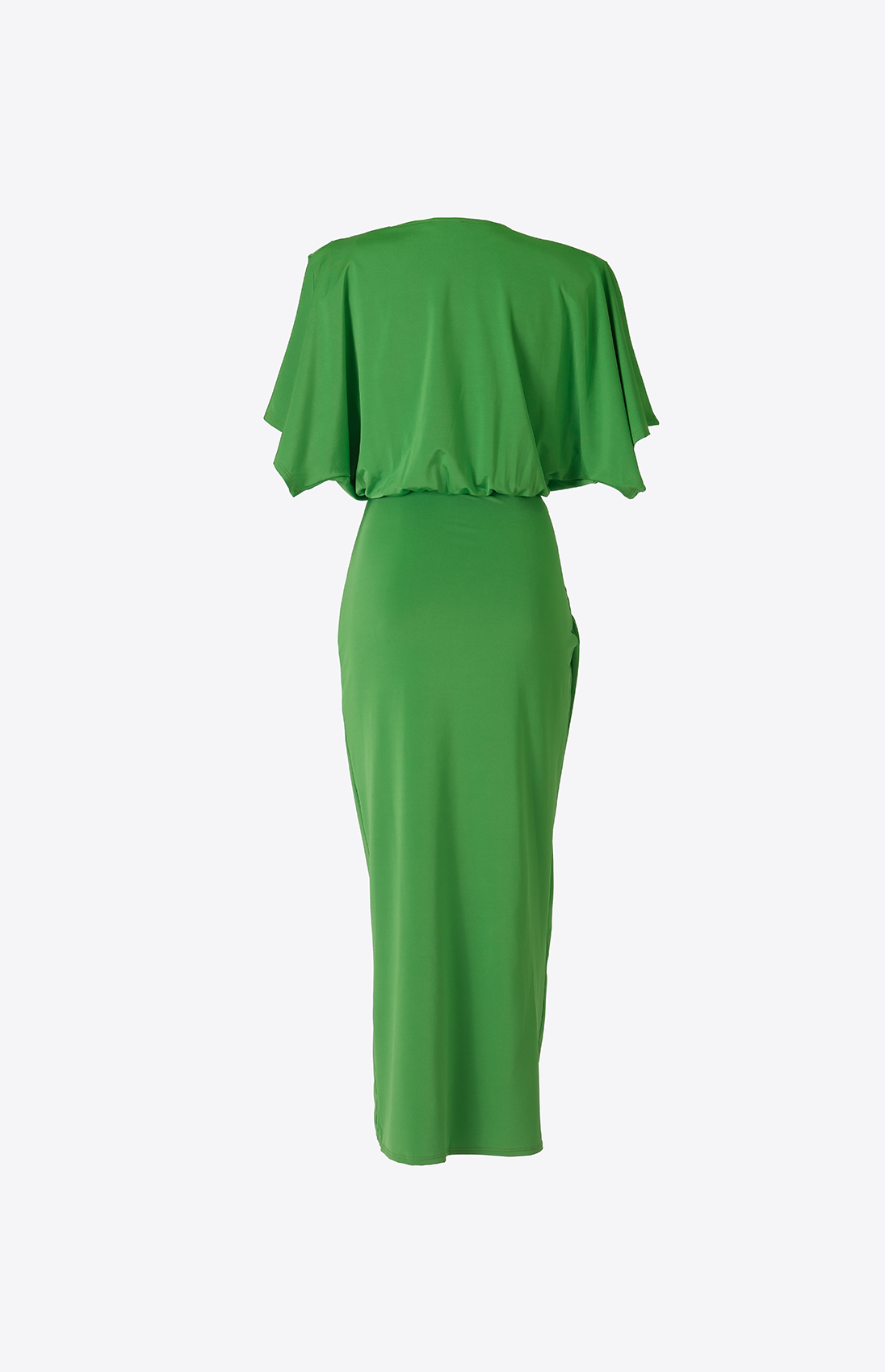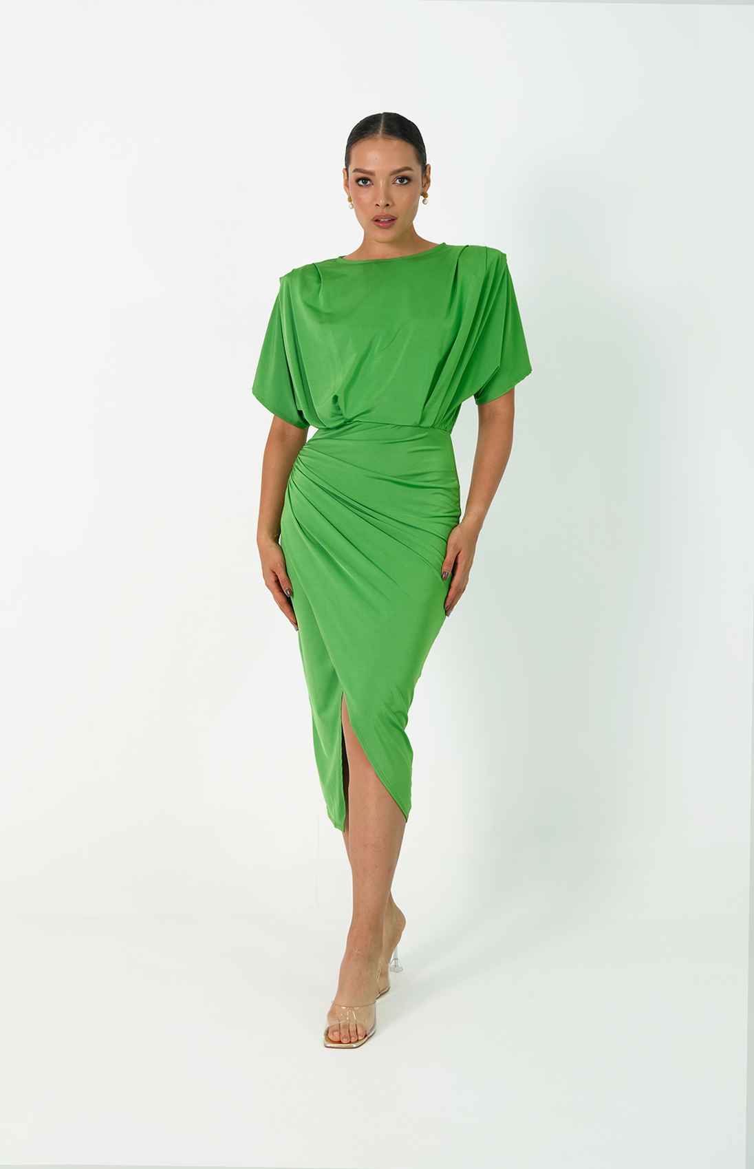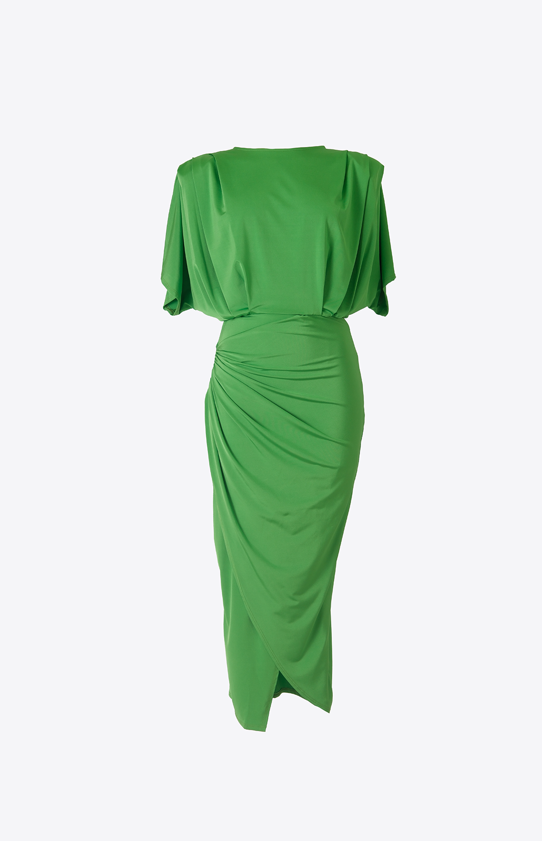 Este vestido corto negro de manga corta presenta un elegante cuello redondo y un detalle surcido a un lado que aporta un sofisticado toque de textura y movimiento. Perfecto para ocasiones especiales, combina sobriedad y estilo en una silueta moderna y refinada.