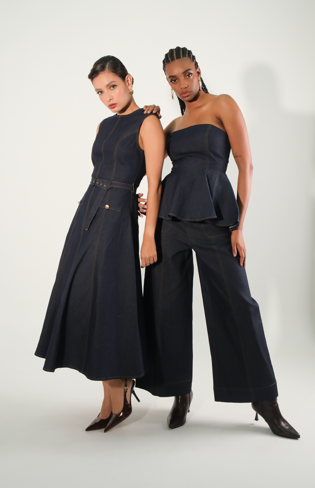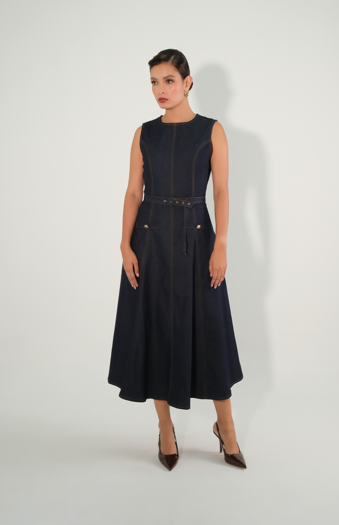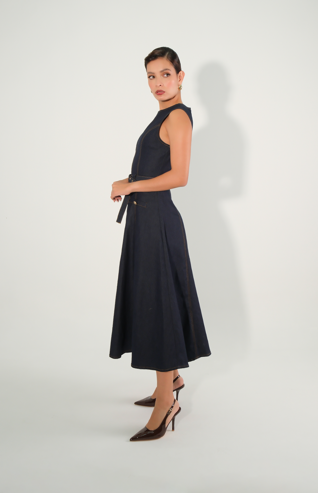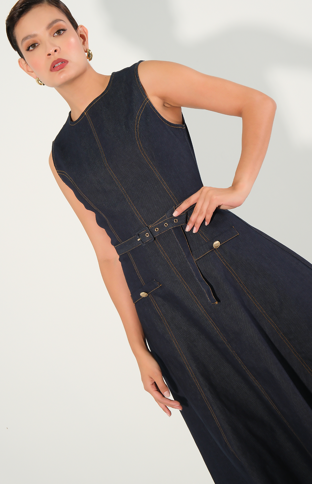 Vestido en denim con mangas sisa que ofrecen comodidad y movimiento, complementado por una correa ajustable que define la silueta. La tela de denim de calidad garantiza durabilidad y un acabado impecable.
