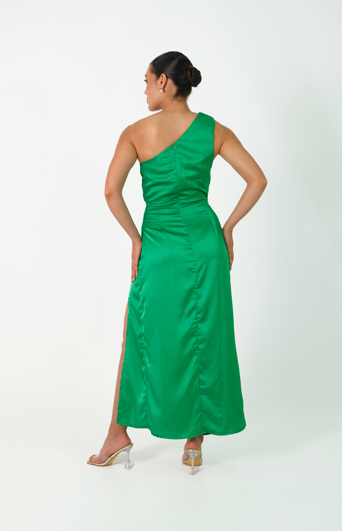 Descubre la elegancia del vestido satinado de un solo hombro, diseñado con un delicado drapeado y un llamativo nudo a la izquierda que realza tu silueta. Sus aberturas en las piernas aportan un toque atrevido y sofisticado, ideal para brillar en cualquier ocasión especial. Disponible en los cautivadores tonos verde esmeralda y verde pistacho, este vestido es la elección perfecta para quienes buscan destacar con estilo y personalidad.
