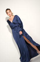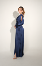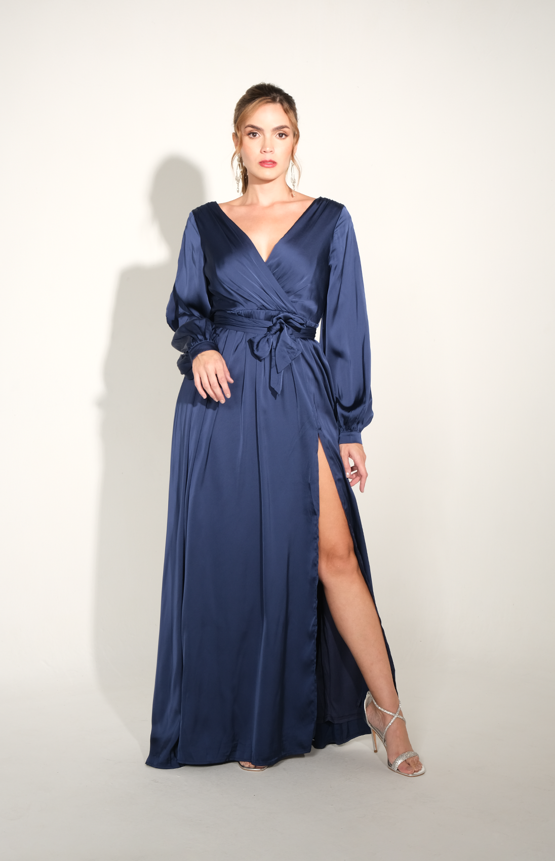 Este vestido satinado en azul turquí destaca por su diseño de manga larga y una tira de amarrar que realza la cintura con delicadeza. La abertura en la manga y en la pierna añade un toque de sofisticación y fluidez, perfecto para ocasiones donde la elegancia y el estilo refinado son imprescindibles.