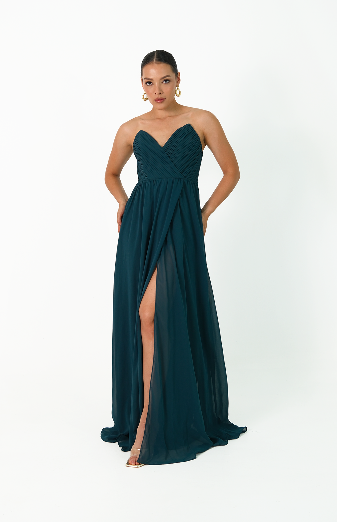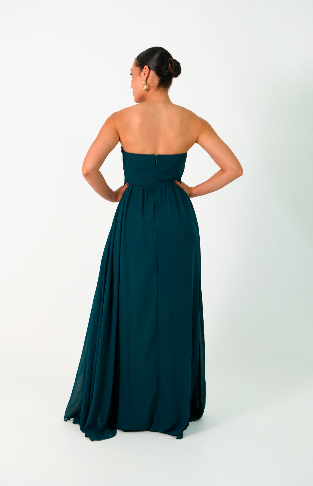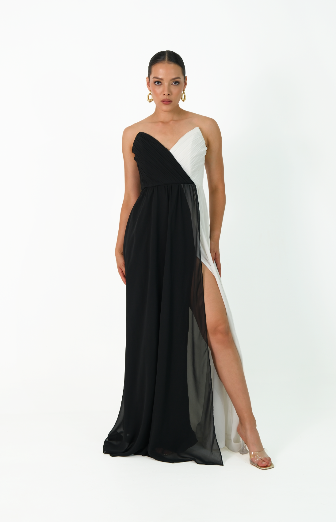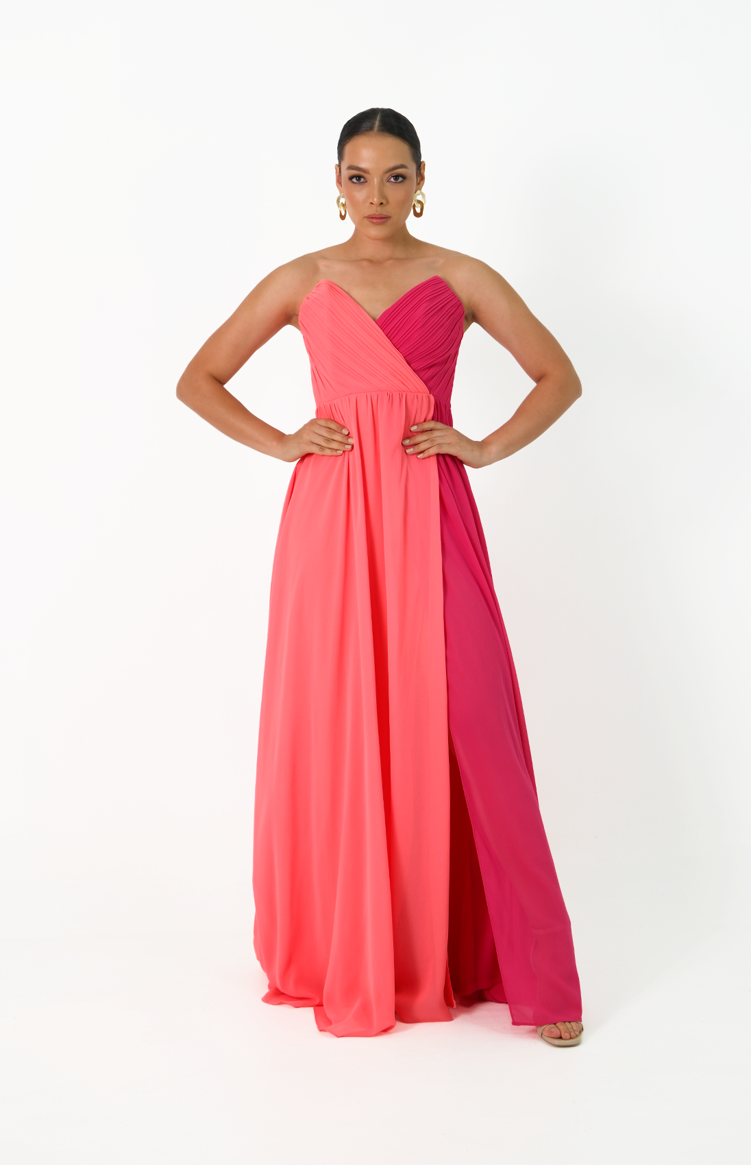 Este vestido strapless resalta con su audaz mezcla de colores: verde botella, fucsia-naranja y blanco-negro. Su diseño vibrante y exclusivo realza tu silueta, ofreciendo un look moderno y sofisticado. Ideal para quienes desean proyectar confianza y elegancia en cualquier evento especial.