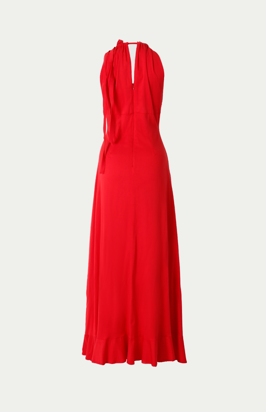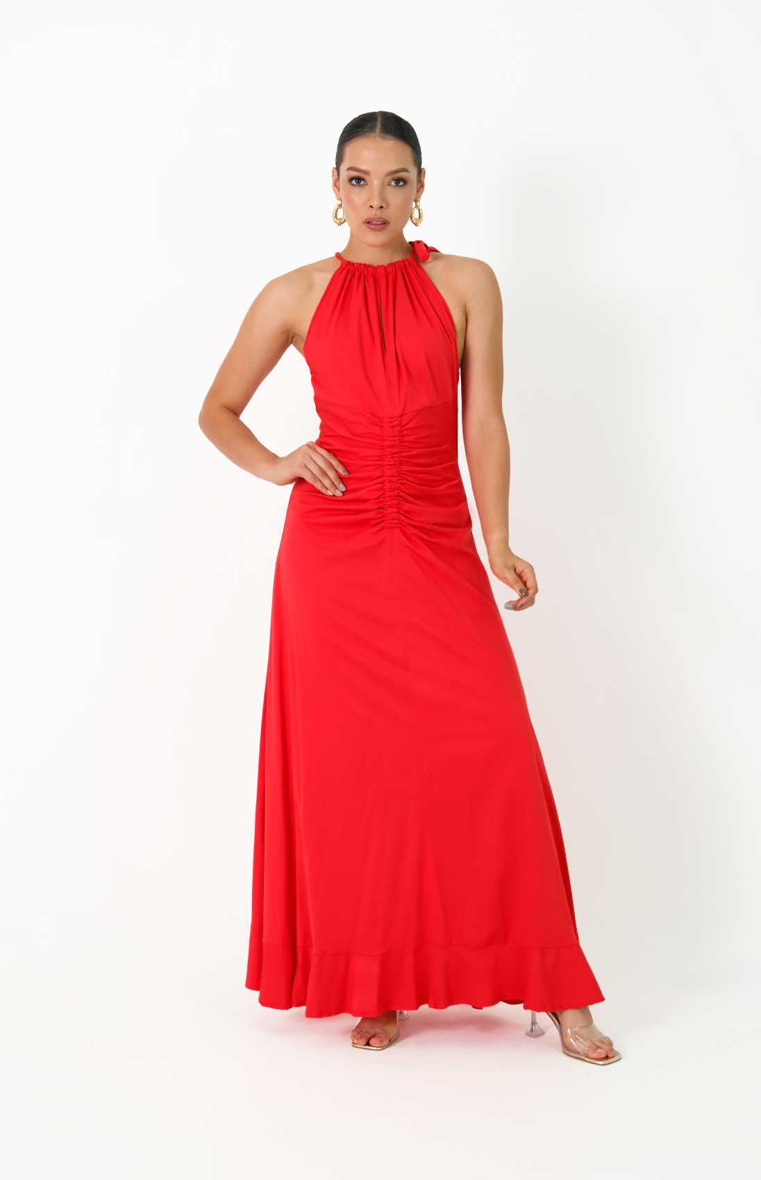 Este vestido rojo largo combina elegancia y estilo sofisticado con manga siza y un delicado cordón que permite ajustar el talle. Su diseño fruncido en el centro realza la figura, mientras que la abertura en el busto añade un toque de sensualidad sutil, perfecto para ocasiones especiales.