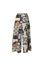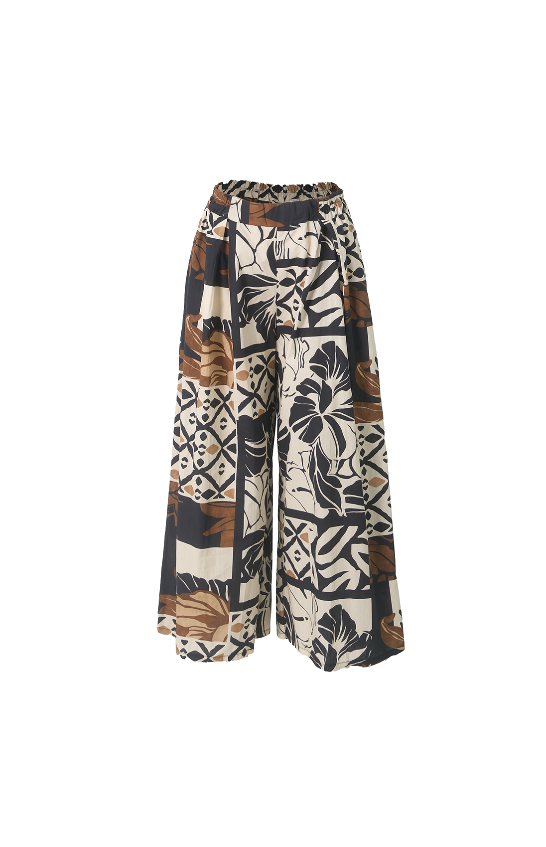 Pantalón estampado en tonos azul y café, con resorte en la cintura para un ajuste cómodo y un look moderno.
