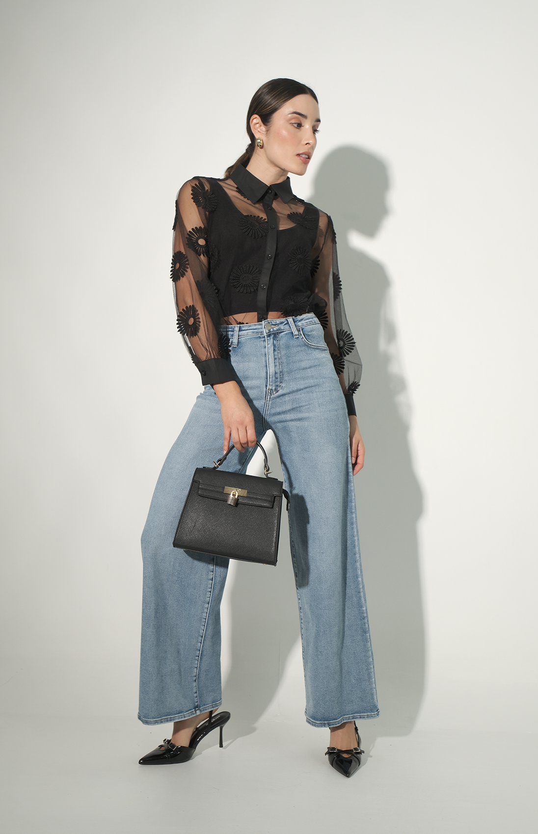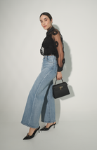 Jean azul claro wide leg stretch, tiro alto, con dobladillo y bolsillos