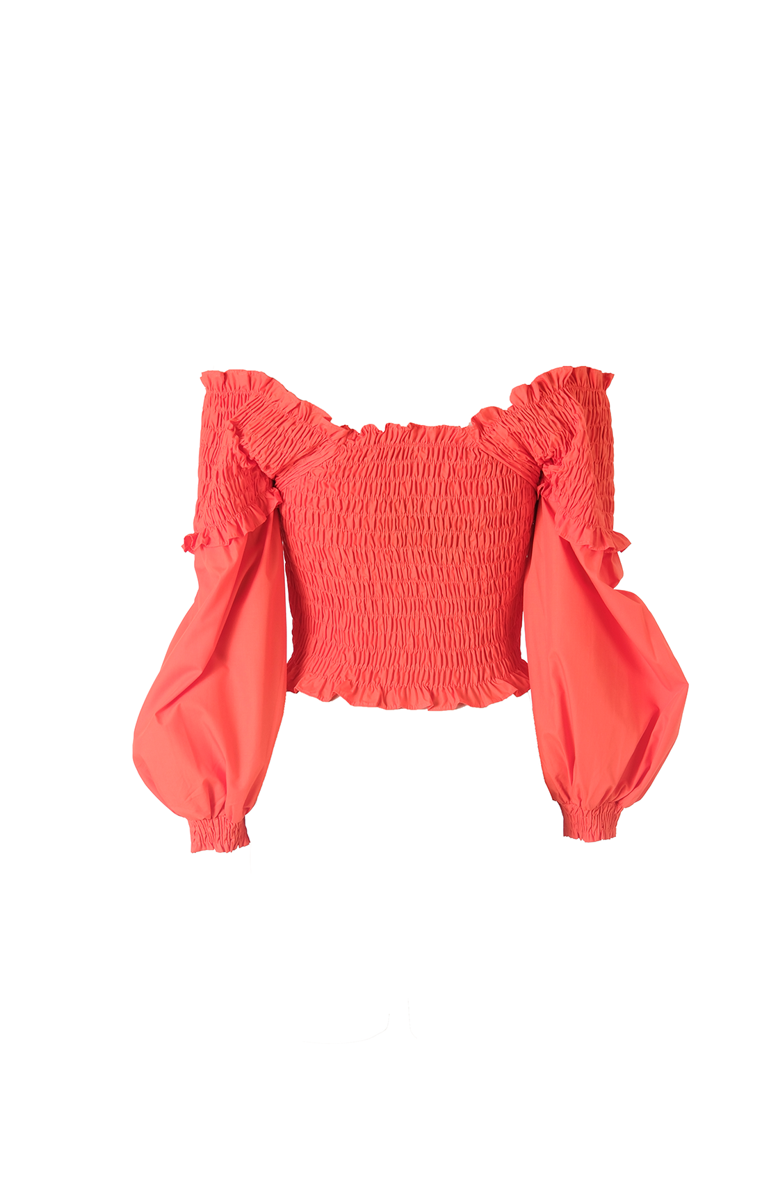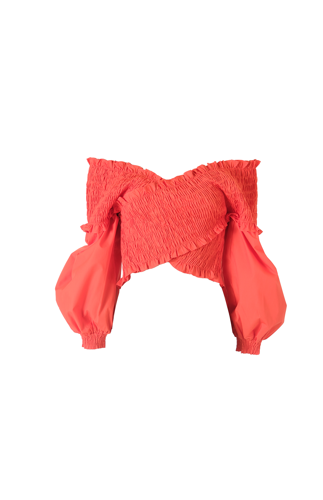 Blusa enresortada, cruzada, en blanco y naranja, con mangas largas y resorte en los puños, es perfecta para un look cómodo y estiloso. ¡