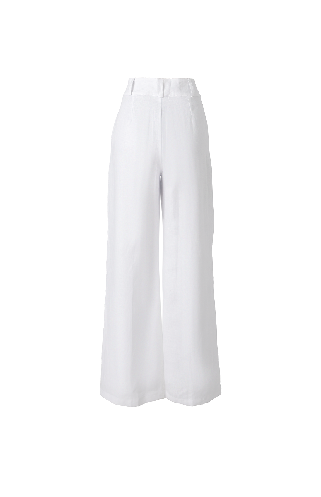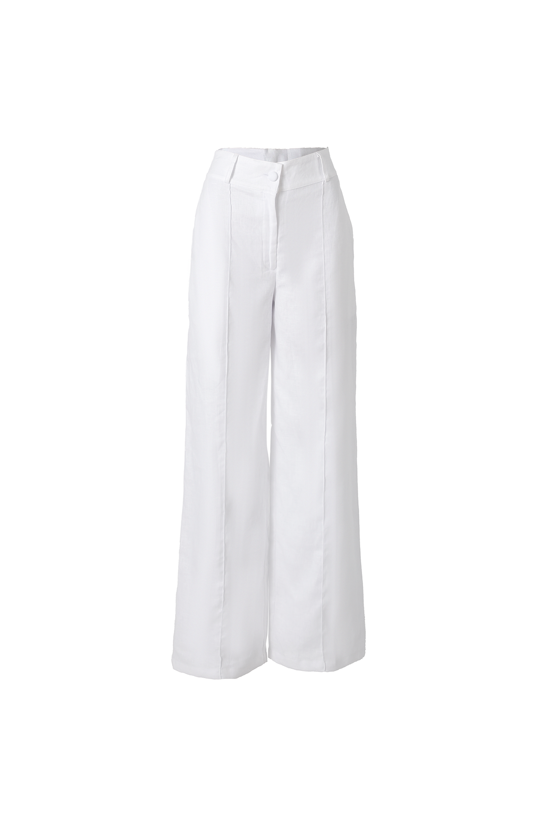 Este elegante pantalón blanco en lino cuenta con una pretina ancha y una vena en la parte frontal de las botas, ofreciendo un diseño sofisticado y moderno. Sin bolsillos en la parte trasera y con un botón forrado, este pantalón está forrado para mayor comodidad. Perfecto para combinar con el chaleco del mismo material para un conjunto impecable.