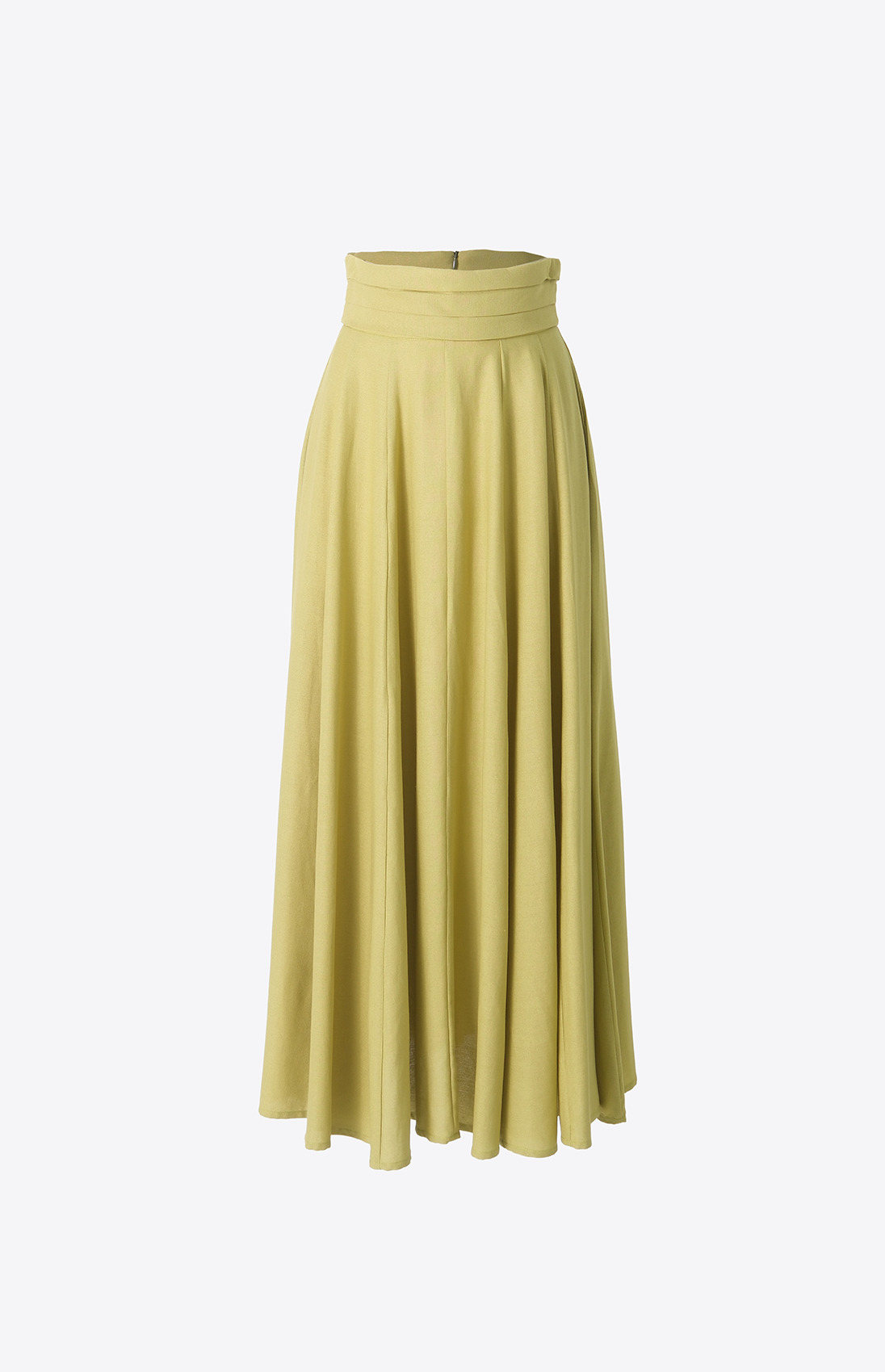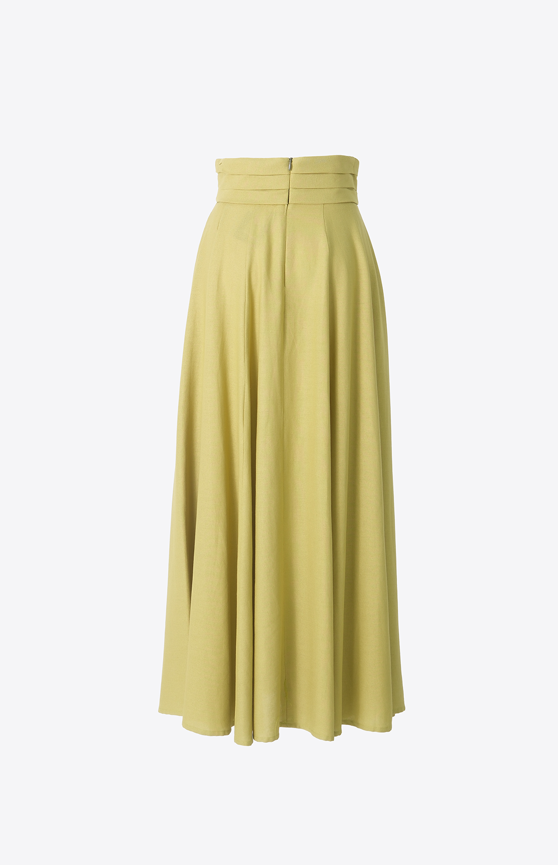 Esta falda de lino en tono verde pistacho presenta un diseño tipo A con una pretina gruesa, prenses y prácticos bolsillos. Perfecta para un look fresco y sofisticado, ideal para cualquier ocasión.