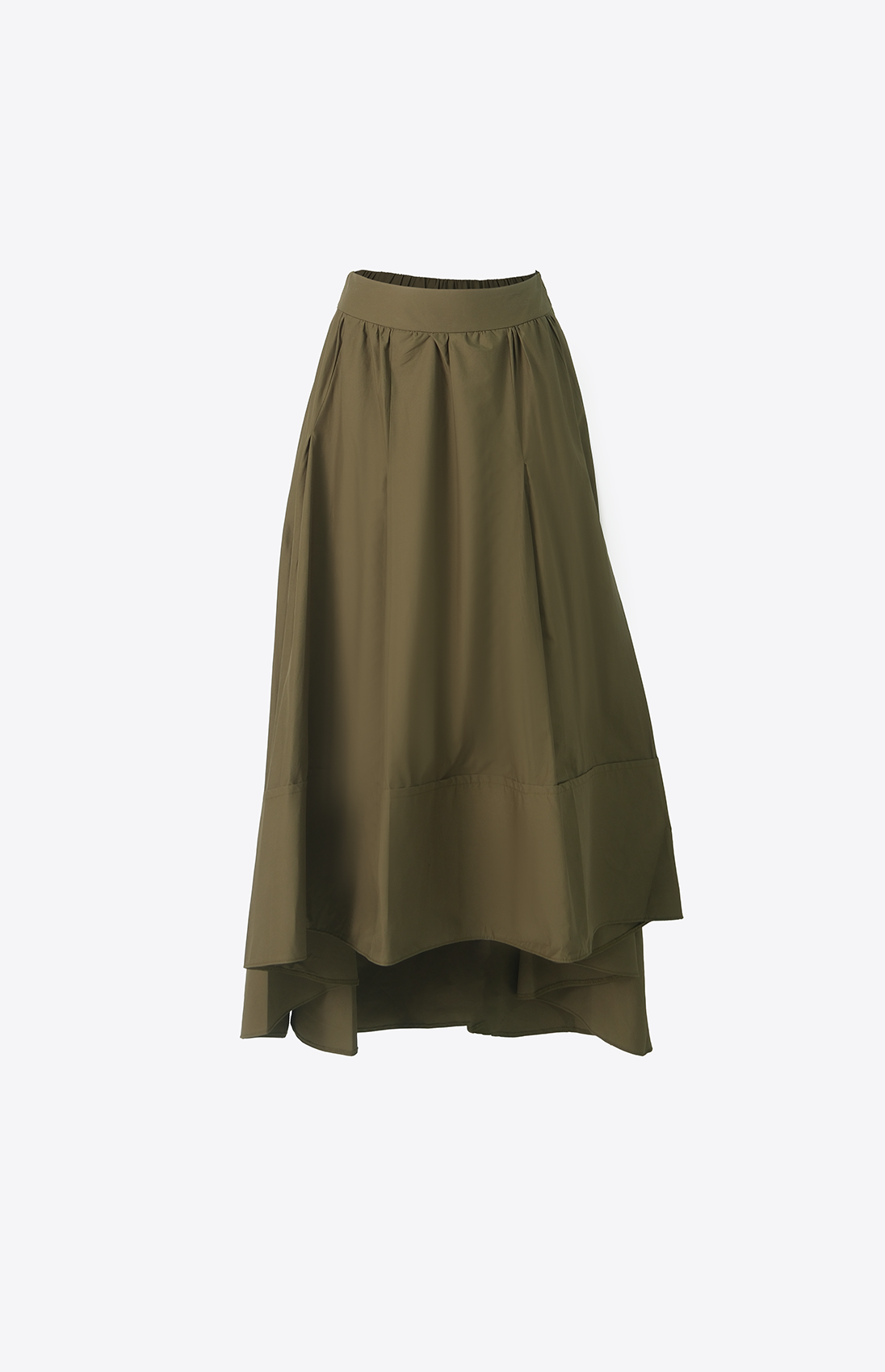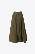Esta falda presenta un diseño de cola de pato en tono verde militar, con tablas y un elegante forro de tul. Una pieza única que combina estructura y feminidad para un look impactante.