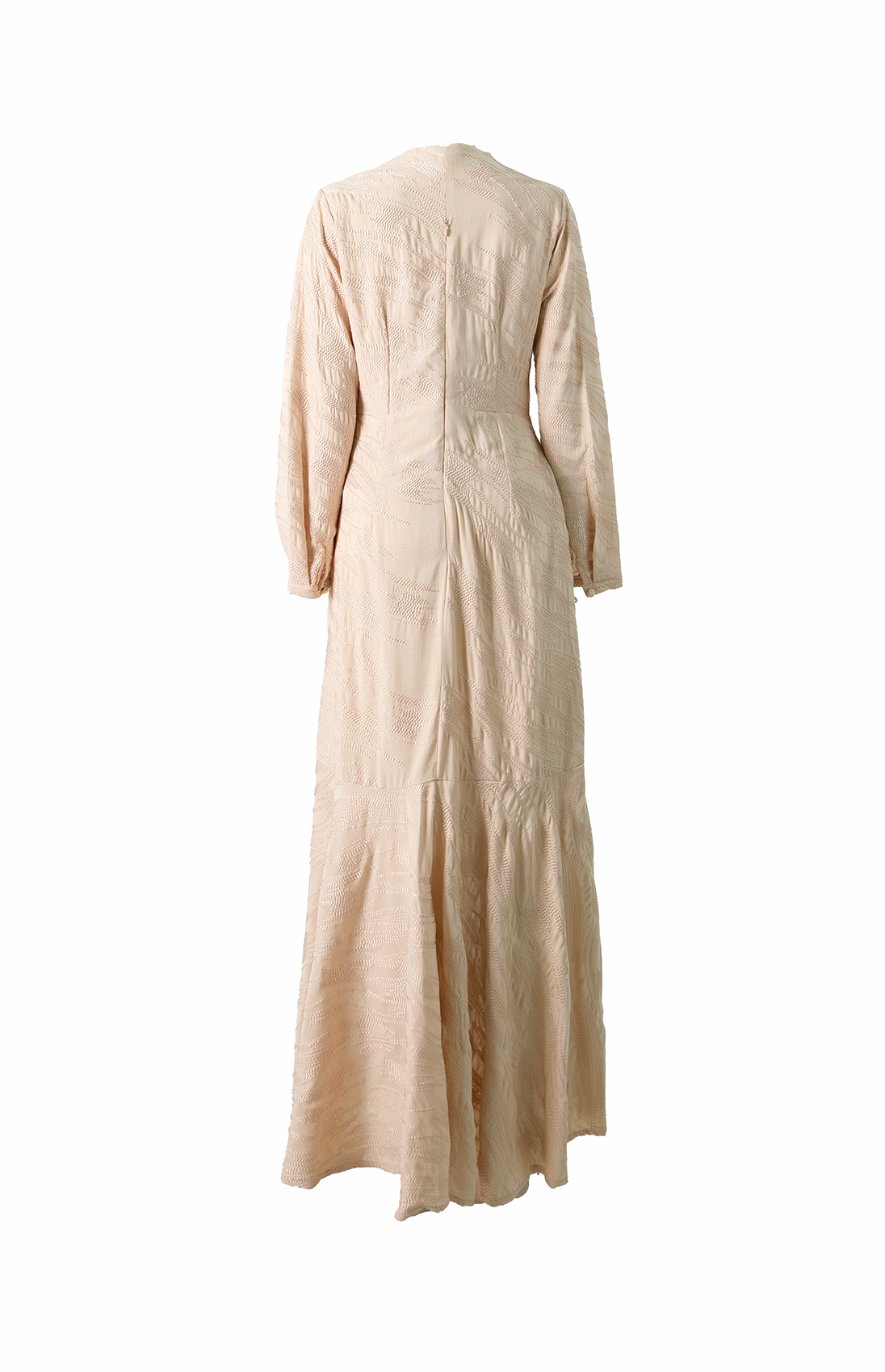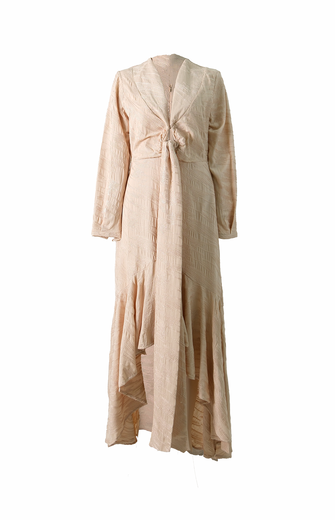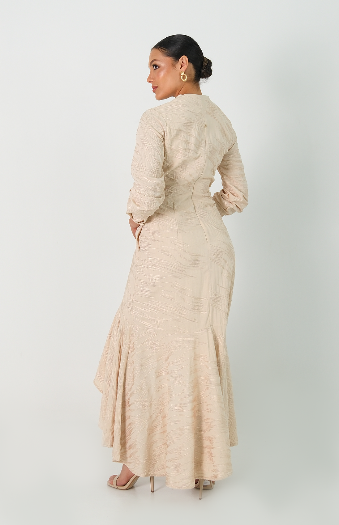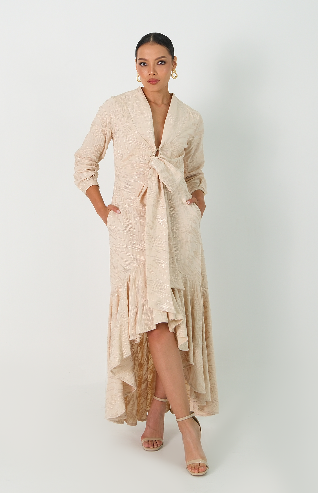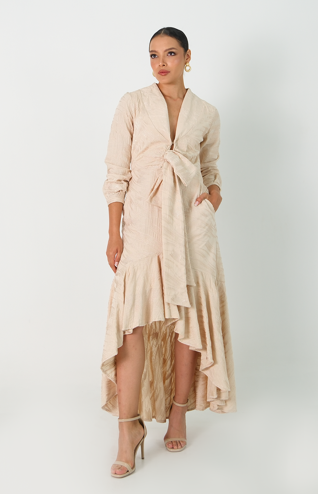 Vestido largo beige con bordado, escote en V profundo y mangas largas con tiras para amarrar en el busto. Diseño fluido con bolsillos, bolero en el ruedo y corte asimétrico, más largo atrás y corto adelante, ideal para un look bohemio y elegante.