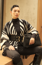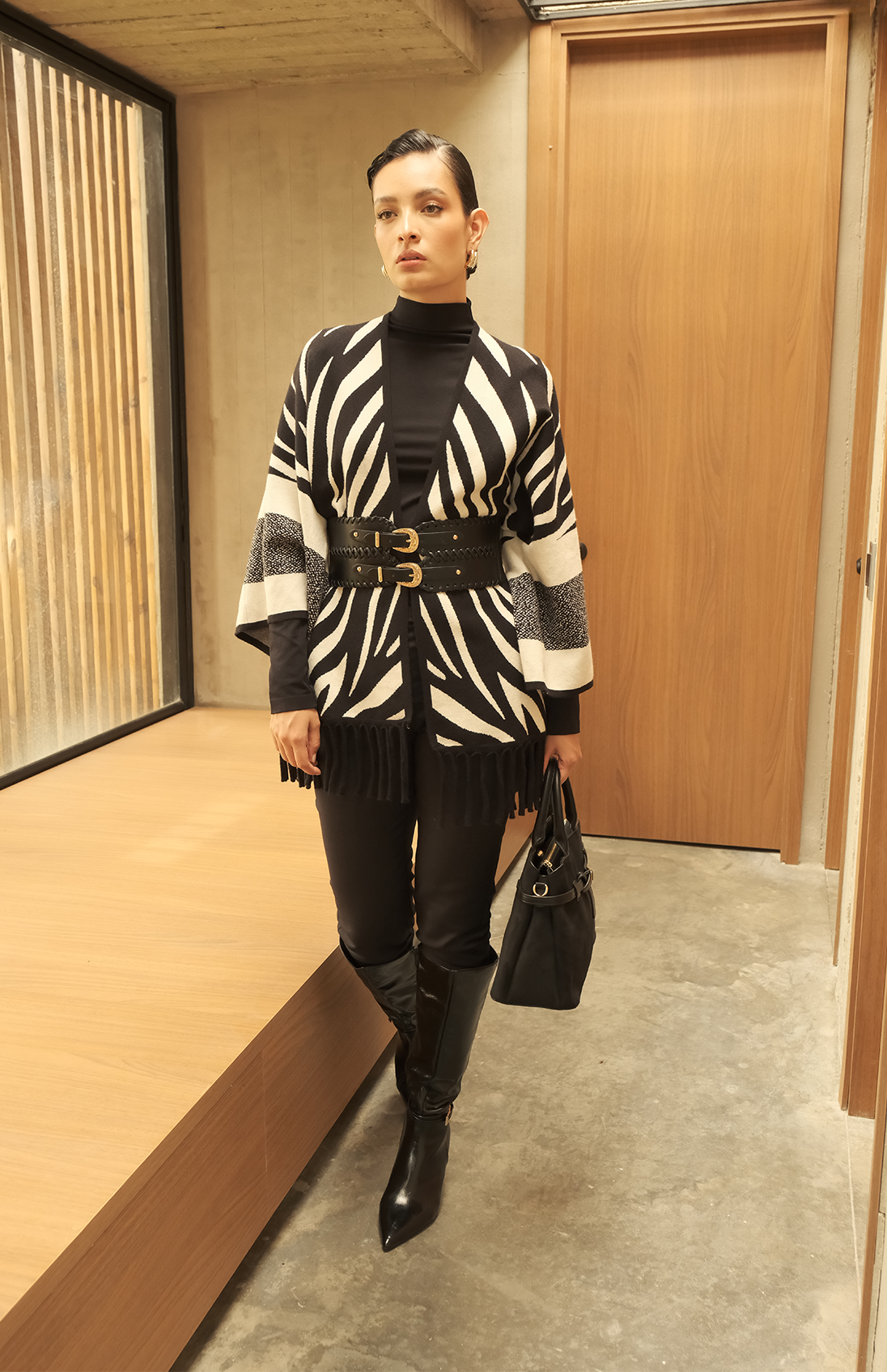 Ruana larga tejida combina elegancia y comodidad con un diseño estampado delicado. Su acabado con flecos en la parte inferior añade un toque sofisticado y moderno.Perfecta para brindar calidez sin perder la gracia.